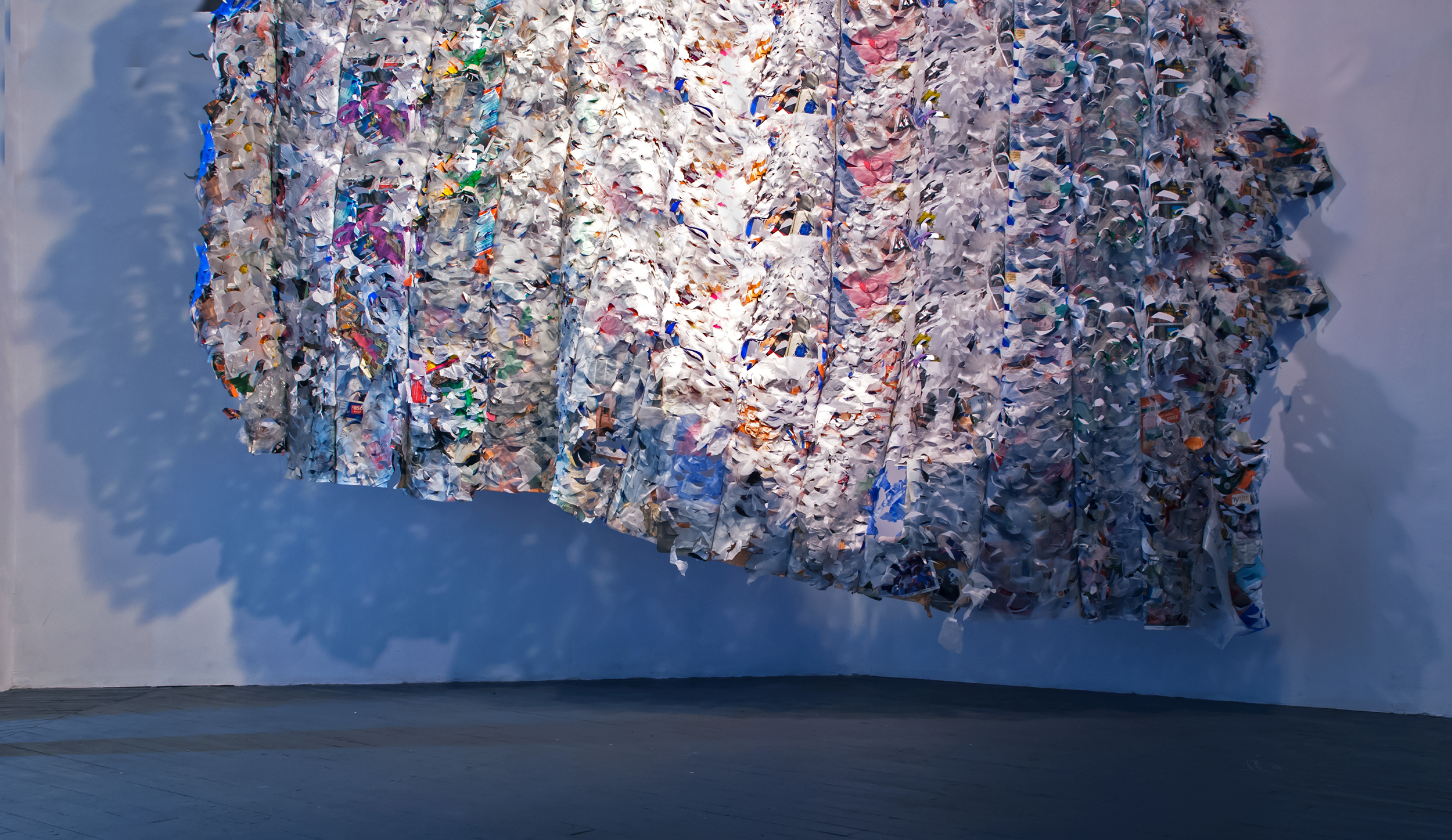 Paper, advertisements, newspapers, junk mail, tissue paper, pigment suspended in matte medium, thread, light